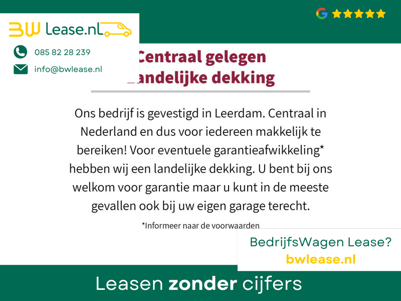 – 3 maanden garantie – Landelijke dekking € 995,- (€ 995 ex BTW): 3 Maanden (max. 7.500km) volledige garantie, deze garantie heeft een landelijke dekking. U bent bij ons welkom voor garantie maar u kunt in de meeste gevallen ook bij uw eigen garage terecht. De auto wordt geleverd met complete check-up, kleine onderhoudsbeurt en nieuwe APK-keuring incl. adviespunten. Informeer naar de voorwaarden.