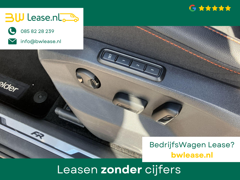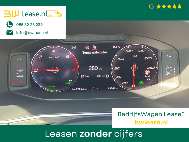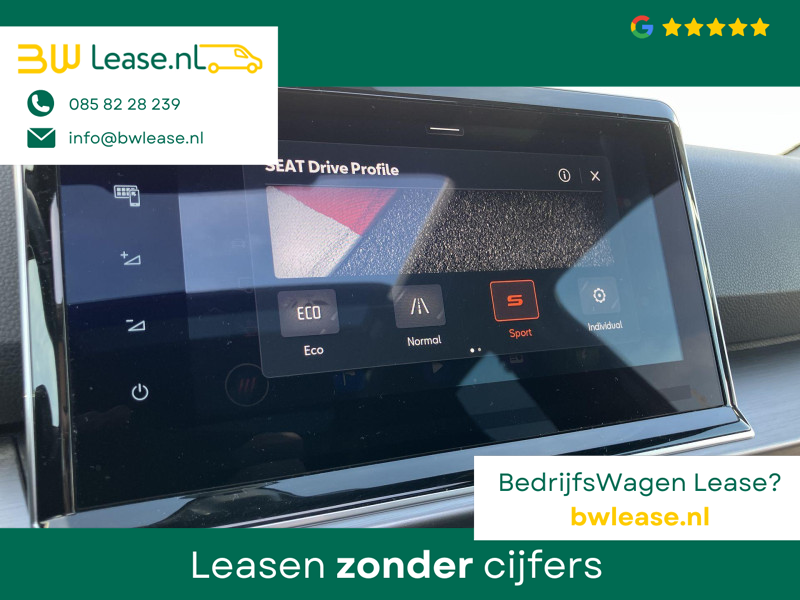 Met het digitale dashboard in deze auto kunt u de interface van uw cockpit personaliseren. Ongelukken of parkeerschade? Dat gebeurt u niet meer, met de achteruitrijcamera. Adaptive cruise control is veilig en comfortabel. De snelheidsregelaar houdt automatisch afstand tot het voertuig dat voor u rijdt. Dankzij Connected Services weet u precies waar uw auto geparkeerd staat. Ook andere functies, zoals bandenspanning en brandstofniveau, zijn via de app altijd onder handbereik. Door de draadloze oplaadmogelijkheid voor telefoons bent u verlost van kabels en snoertjes. Het opladen gaat simpel door de smartphone in de speciale houder te plaatsen. Ook is de SEAT uitgerust met: full map navigatiesysteem, automatische airconditioning, regensensor, keyless entry, automatisch dimmende binnenspiegel en bagage afdekhoes.